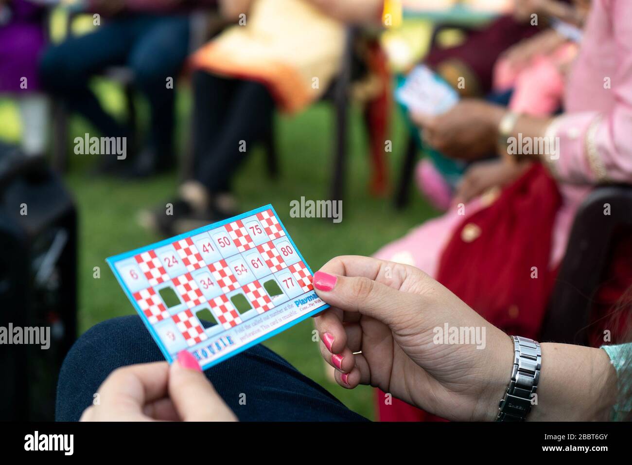 Selective Focus Shot Of Hands Tolding Tambola Bingo Housie Tickets With Some Numbers Folded And People In The Background Stock Photo Alamy
